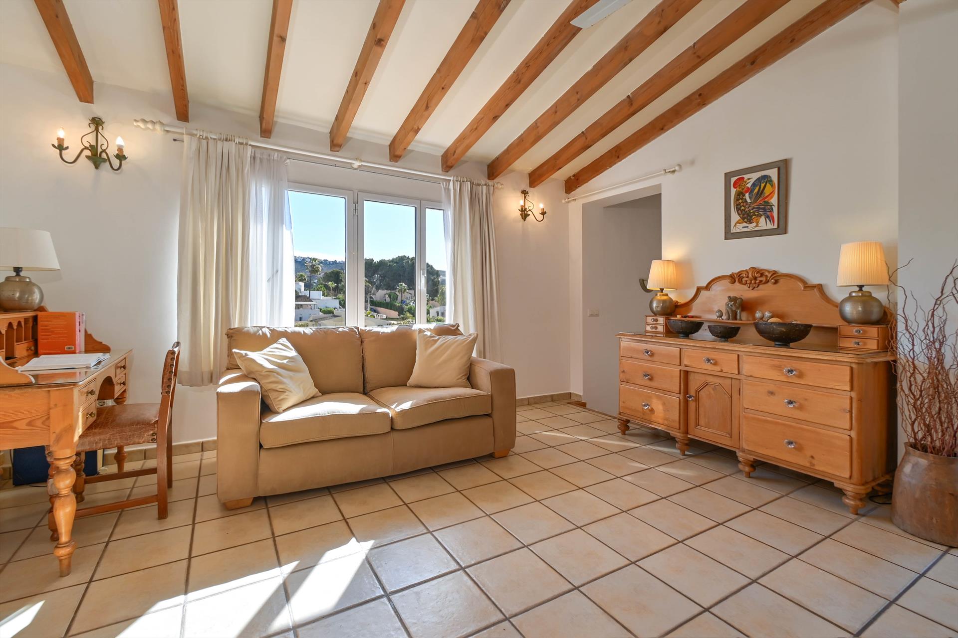 Grote en leuke villa in Moraira, Costa Blanca, Spanje met privé zwembad voor 8 personen. De woning ligt in een residentiële strandomgeving en op 3 km van het strand.De villa heeft 4 slaapkamers en 2 badkamers, verdeeld over 2 verdiepingen. De accommodatie biedt privacy, een tuin met grind en bomen en een mooi zwembad. De nabijheid van het strand, gelegenheden om te winkelen, sportactiviteiten, uitgaansgelegenheden, bezienswaardigheden en cultuur maken dit een geschikte villa om uw vakantie in Spanje door te brengen met familie of vrienden.